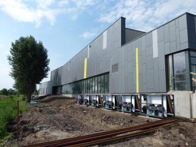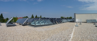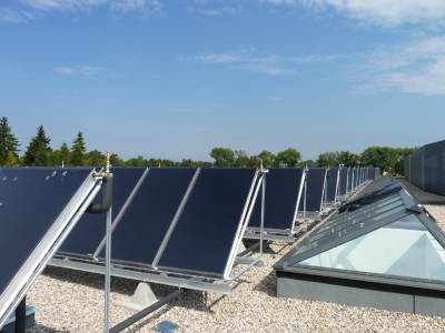 Kaskada 6 powietrznych pomp ciepła WPL 57, pompa ciepła WPF 40 oraz 162 kolektory SOL 27 Basic na dachu obiektu.